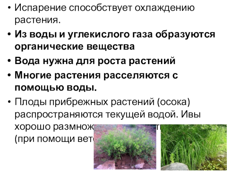 Плоды прибрежных растений (осока)распространяются текущей водой. Ивы хорошо размножаются вегетативным путем (при помощи веток)