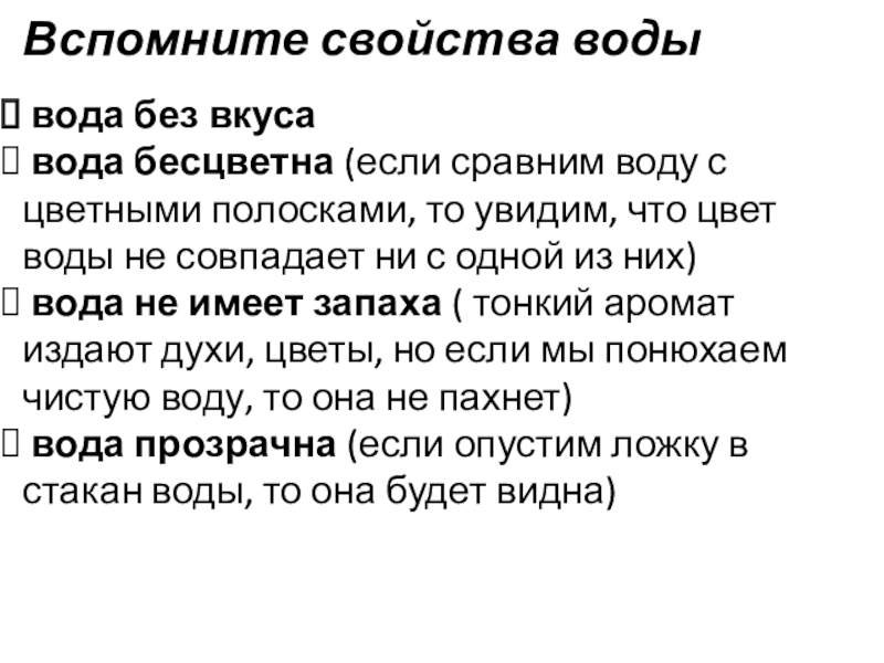 вода не имеет запаха ( тонкий аромат издают духи, цветы, но если мы понюхаем чистую воду, то она не пахнет)