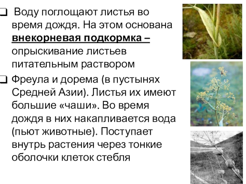 Фреула и дорема (в пустынях Средней Азии). Листья их имеют большие «чаши». Во время дождя в них накапливается вода (пьют животные). Поступает внутрь растения через тонкие оболочки клеток стебля