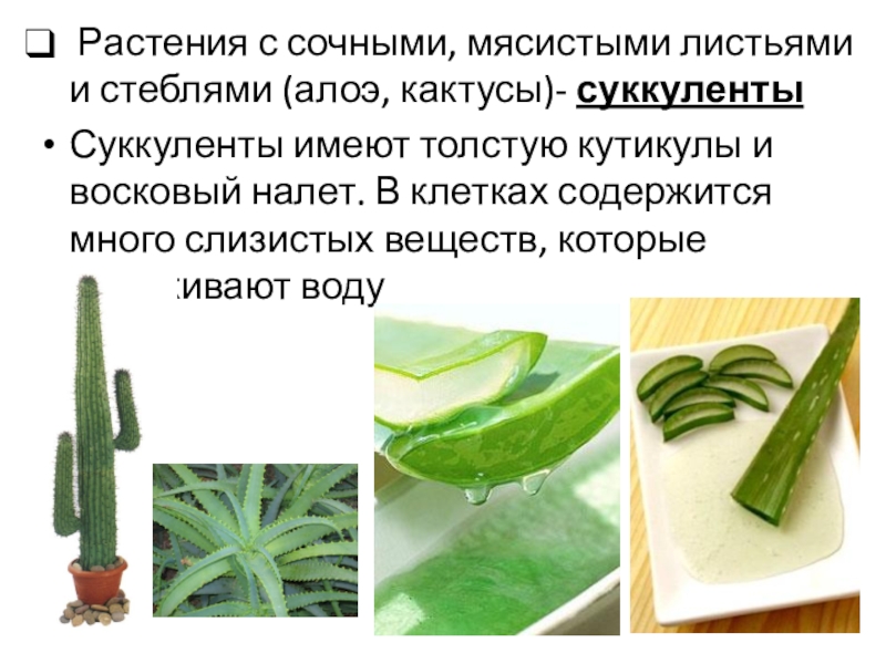 Слайд 10 Растения с сочными, мясистыми листьями и стеблями (алоэ, кактусы)- суккуленты