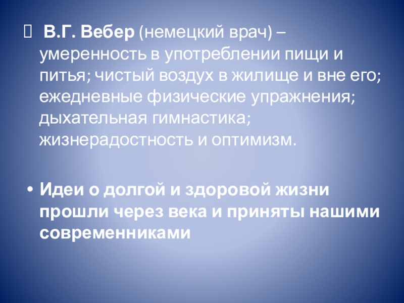Слайд 14 В.Г. Вебер (немецкий врач) – умеренность в употреблении пищи и