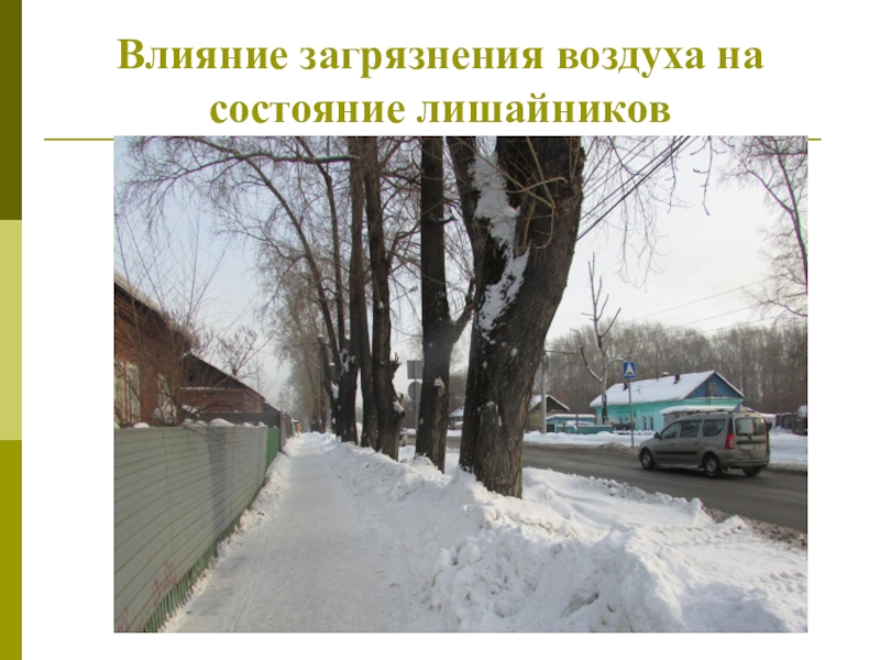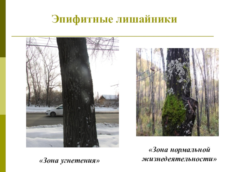 3. Под воздействием загрязняющих веществ, находящихся в воздухе талломы лишайников в угнетённом состоянии, слоевища мелкие, расположены на большой высоте.