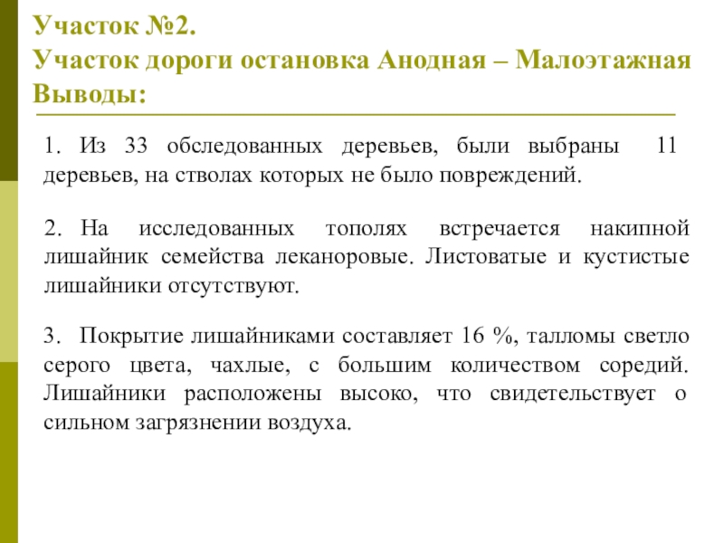 3. Покрытие лишайниками составляет 16 %, талломы светло серого цвета, чахлые, с большим количеством соредий. Лишайники расположены высоко, что свидетельствует о сильном загрязнении воздуха.