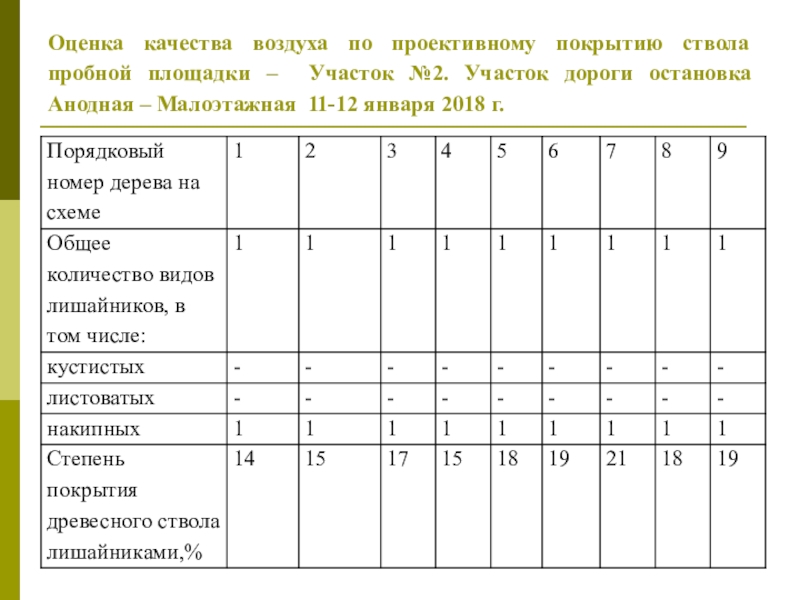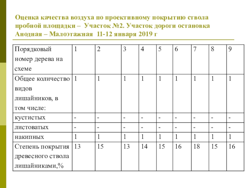 4. За период январь 2018-2019 год проективное покрытие лишайниками уменьшилось на 2,1% , что свидетельствует об умеренном загрязнении воздуха в данном районе, соответствуют «зоне угнетения»
