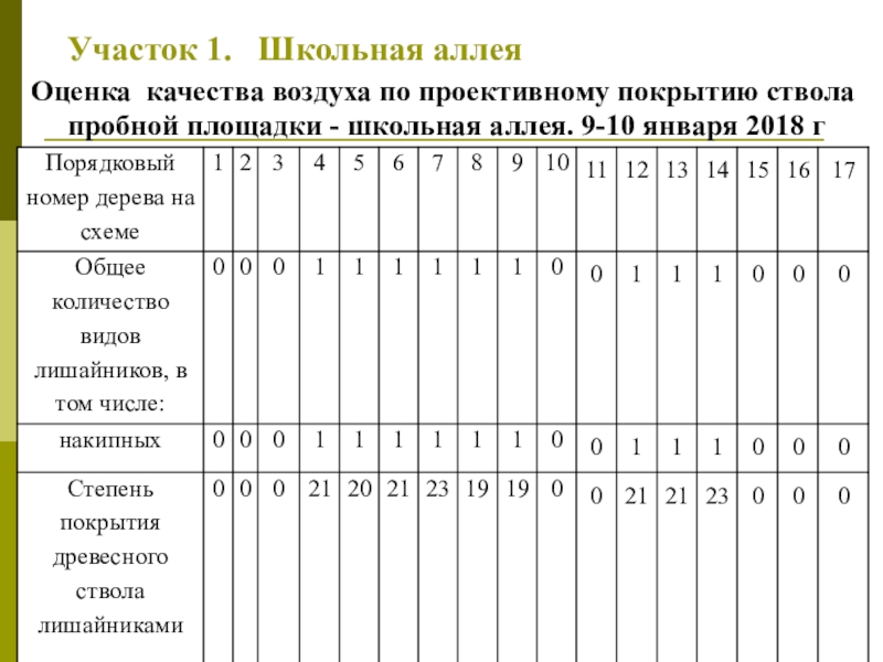 3. Согласно «Шкале качества воздуха по проективному покрытию лишайниками стволов деревьев» рассчитанные данные показали, что степень загрязнения воздуха на участке №1 школьная аллея относится к 1-ой зоне – умеренное загрязнение (менее 20% покрытия лишайниками).