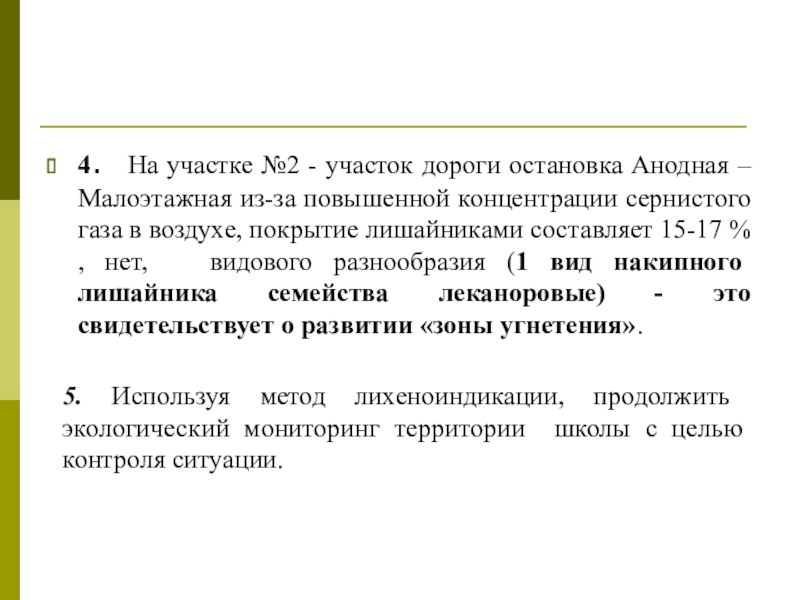 5. Используя метод лихеноиндикации, продолжить экологический мониторинг территории школы с целью контроля ситуации.