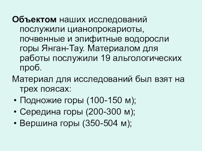 Объектом наших исследований послужили цианопрокариоты, почвенные и эпифитные водоросли горы Янган-Тау. Материалом для работы послужили 19 альгологических