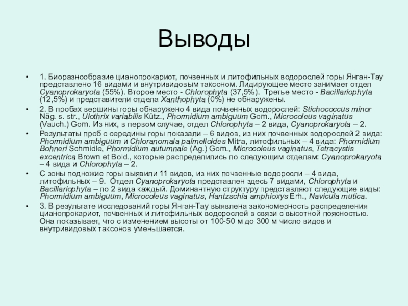 Выводы1. Биоразнообразие цианопрокариот, почвенных и литофильных водорослей горы Янган-Тау представлено 16 видами и внутривидовым таксоном. Лидирующее место