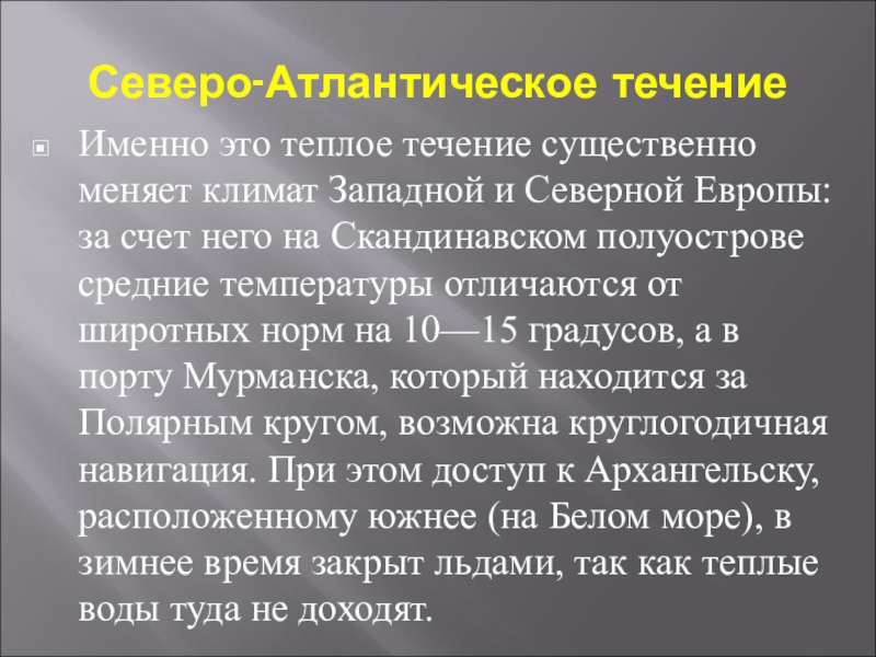 Европы: за счет него на Скандинавском полуострове средние температуры отличаются от широтных норм на 10—15 градусов, а в порту Мурманска, который находится за Полярным кругом, возможна круглогодичная навигация. При этом доступ к Архангельску, расположенному южнее (на Белом море), в зимнее время закрыт льдами, так как теплые воды туда не доходят.