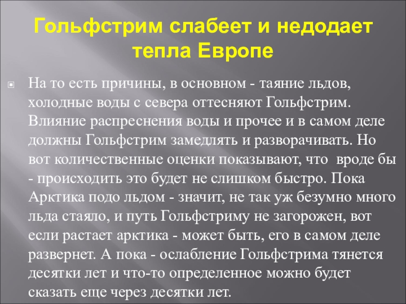 Влияние распреснения воды и прочее и в самом деле должны Гольфстрим замедлять и разворачивать. Но вот количественные оценки показывают, что вроде бы - происходить это будет не слишком быстро. Пока Арктика подо льдом - значит, не так уж безумно много льда стаяло, и путь Гольфстриму не загорожен, вот если растает арктика - может быть, его в самом деле развернет. А пока - ослабление Гольфстрима тянется десятки лет и что-то определенное можно будет сказать еще через десятки лет.