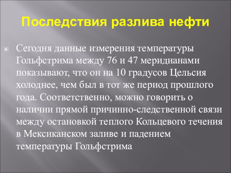 меридианами показывают, что он на 10 градусов Цельсия холоднее, чем был в тот же период прошлого года. Соответственно, можно говорить о наличии прямой причинно-следственной связи между остановкой теплого Кольцевого течения в Мексиканском заливе и падением температуры Гольфстрима
