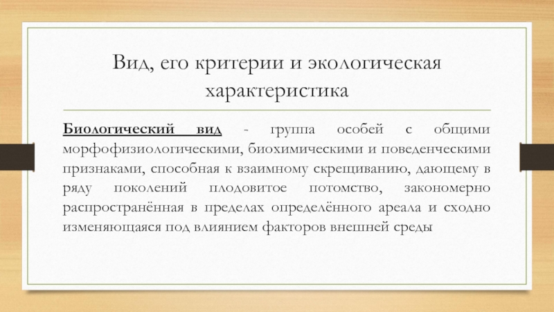 общими морфофизиологическими, биохимическими и поведенческими признаками, способная к взаимному скрещиванию, дающему в ряду поколений плодовитое потомство, закономерно распространённая в пределах определённого ареала и сходно изменяющаяся под влиянием факторов внешней среды