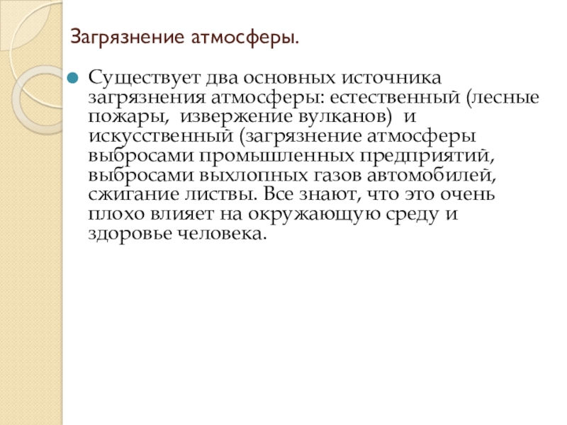 вулканов) и искусственный (загрязнение атмосферы выбросами промышленных предприятий, выбросами выхлопных газов автомобилей, сжигание листвы. Все знают, что это очень плохо влияет на окружающую среду и здоровье человека.
