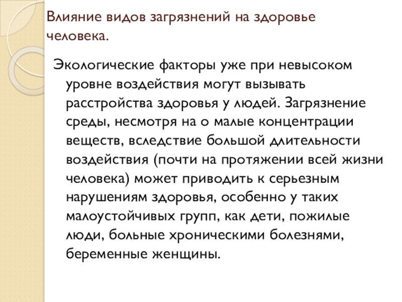 Слайд 15Влияние видов загрязнений на здоровье человека.