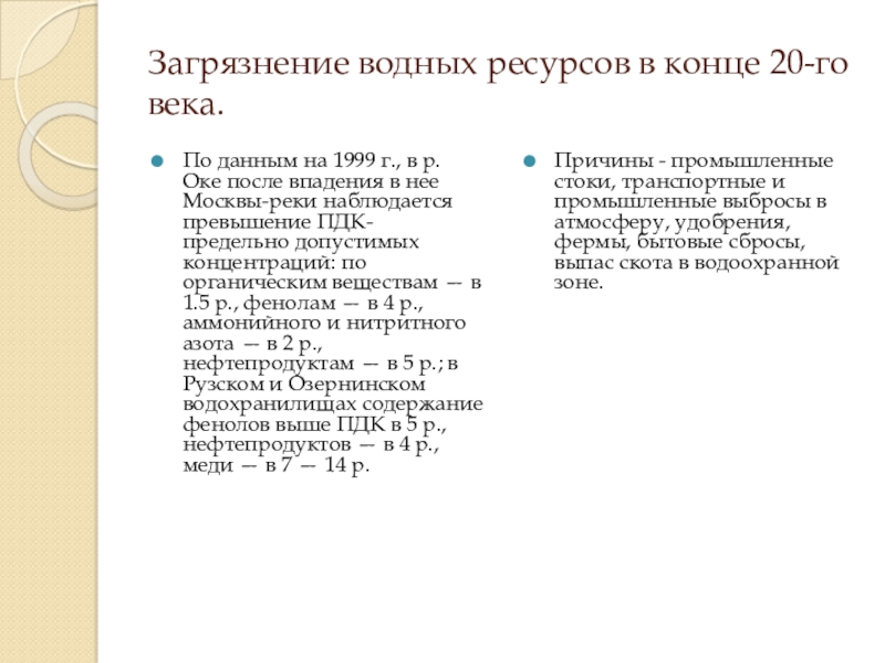 в р. Оке после впадения в нее Москвы-реки наблюдается превышение ПДК- предельно допустимых концентраций: по органическим веществам — в 1.5 р., фенолам — в 4 р., аммонийного и нитритного азота — в 2 р., нефтепродуктам — в 5 р.; в Рузском и Озернинском водохранилищах содержание фенолов выше ПДК в 5 р., нефтепродуктов — в 4 р., меди — в 7 — 14 р.