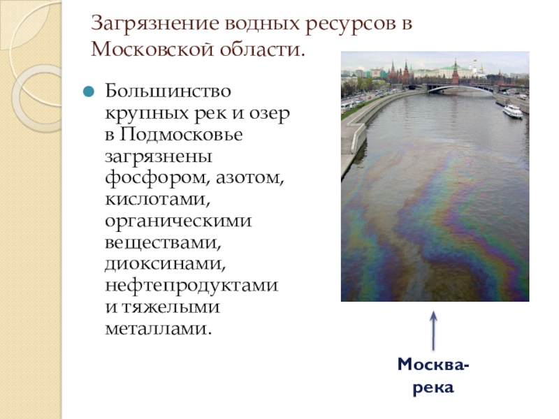Подмосковье загрязнены фосфором, азотом, кислотами, органическими веществами, диоксинами, нефтепродуктами и тяжелыми металлами.