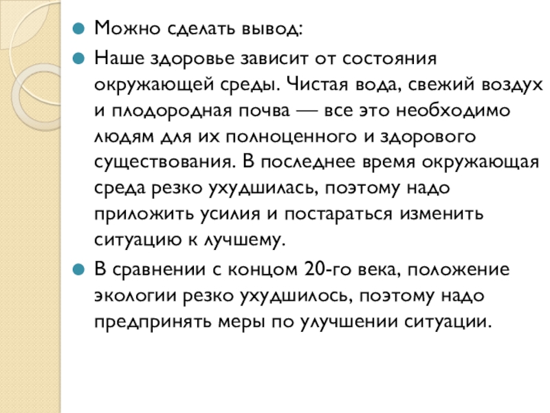 свежий воздух и плодородная почва — все это необходимо людям для их полноценного и здорового существования. В последнее время окружающая среда резко ухудшилась, поэтому надо приложить усилия и постараться изменить ситуацию к лучшему.