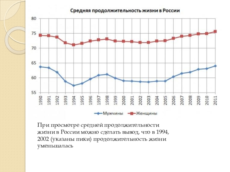 в 1994, 2002 (указаны пики) продолжительность жизни уменьшалась