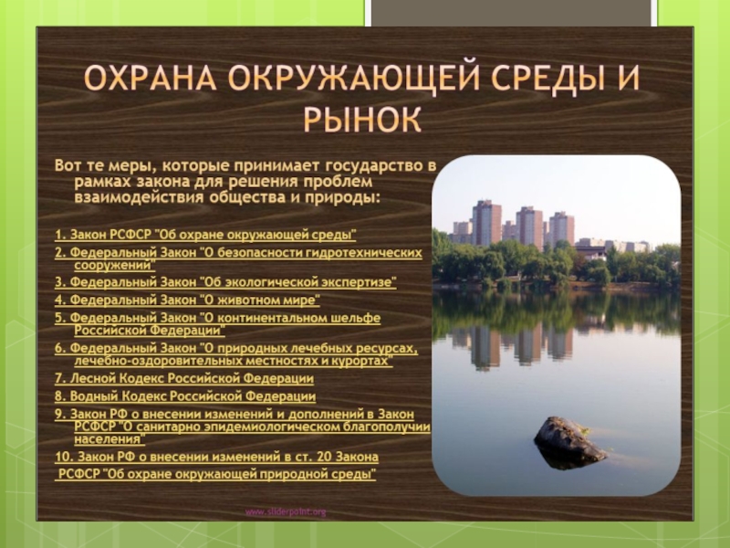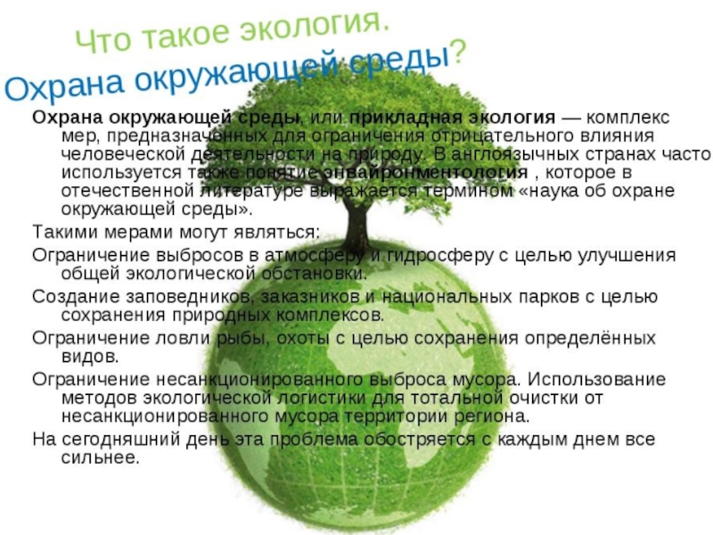 Слайд 2Охрана окружающей среды, или прикладная экология — комплекс мер, предназначенных для ограничения отрицательного влияния