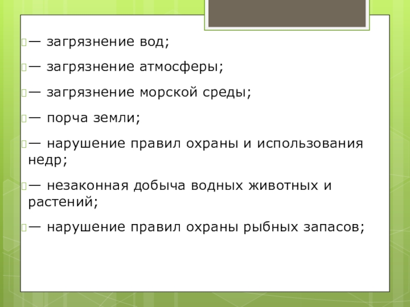 — загрязнение вод;— загрязнение атмосферы;— загрязнение морской среды;— порча земли;— нарушение правил охраны и использования недр;— незаконная