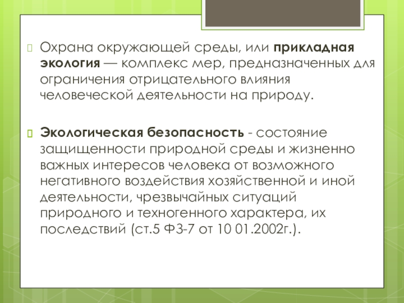 Охрана окружающей среды, или прикладная экология — комплекс мер, предназначенных для ограничения отрицательного влияния человеческой деятельности на природу. Экологическая безопасность - состояние защищенности