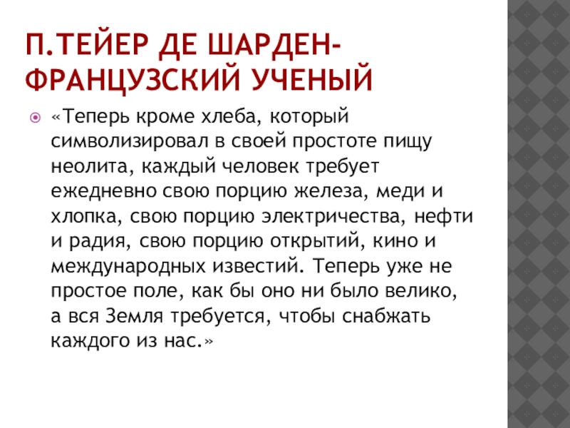 простоте пищу неолита, каждый человек требует ежедневно свою порцию железа, меди и хлопка, свою порцию электричества, нефти и радия, свою порцию открытий, кино и международных известий. Теперь уже не простое поле, как бы оно ни было велико, а вся Земля требуется, чтобы снабжать каждого из нас.»