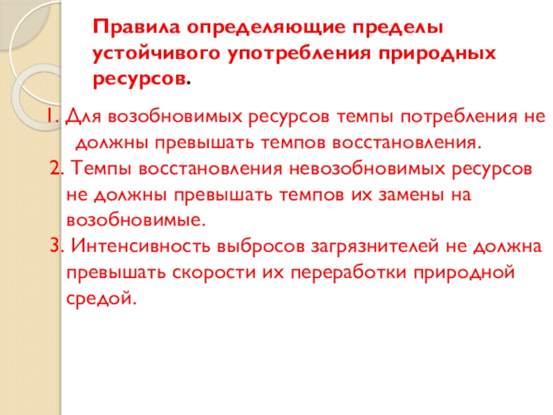 Слайд 14Правила определяющие пределы устойчивого употребления природных ресурсов.