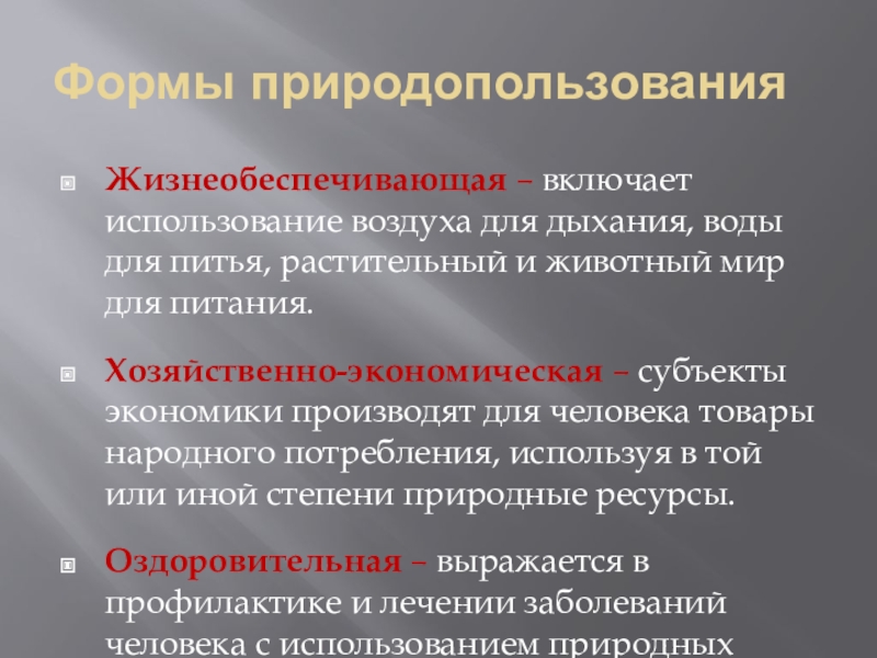 Хозяйственно-экономическая – субъекты экономики производят для человека товары народного потребления, используя в той или иной степени природные ресурсы.