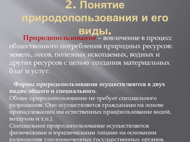 Формы природопользования осуществляются в двух видах: общего и специального.