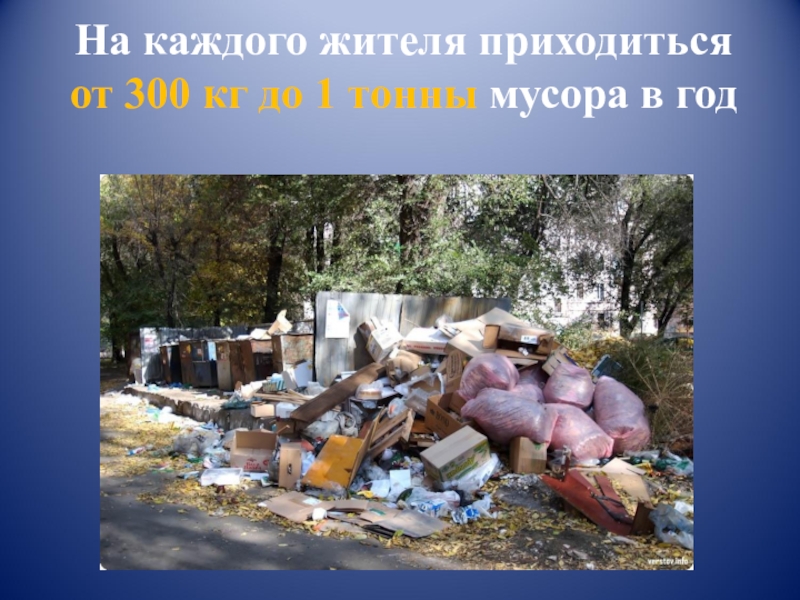 Слайд 4На каждого жителя приходиться от 300 кг до 1 тонны мусора