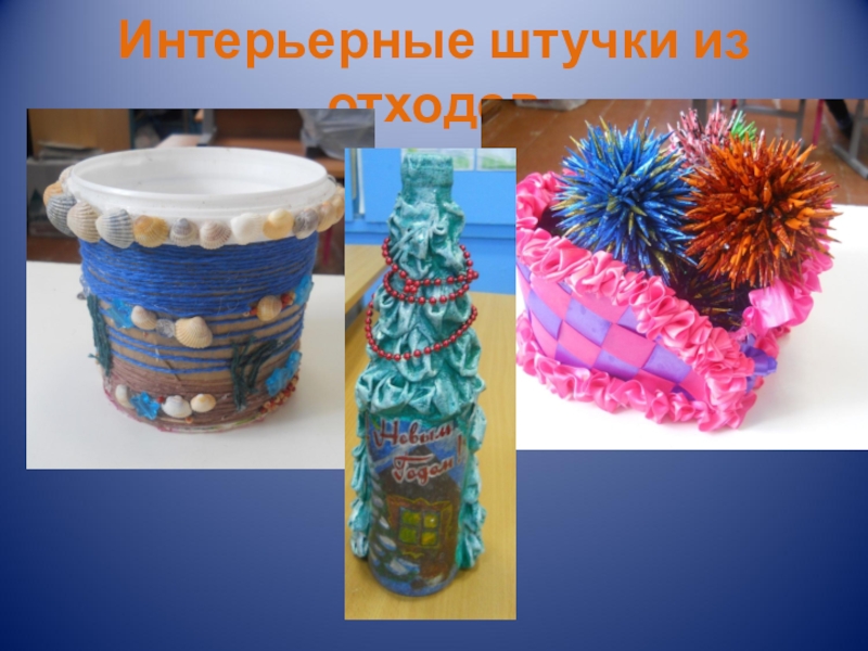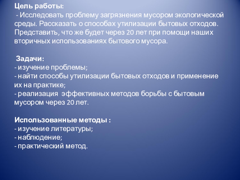 способах утилизации бытовых отходов. Представить, что же будет через 20 лет при помощи наших вторичных использованиях бытового мусора. Задачи: - изучение проблемы; - найти способы утилизации бытовых отходов и применение их на практике; - реализация эффективных методов борьбы с бытовым мусором через 20 лет. Использованные методы : - изучение литературы; - наблюдение; - практический метод.