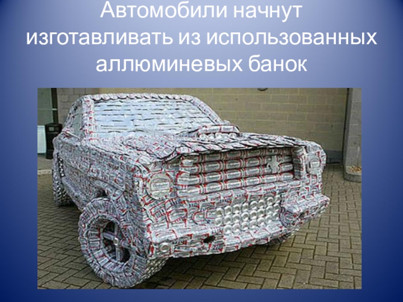 Слайд 33Автомобили начнут изготавливать из использованных аллюминевых банок