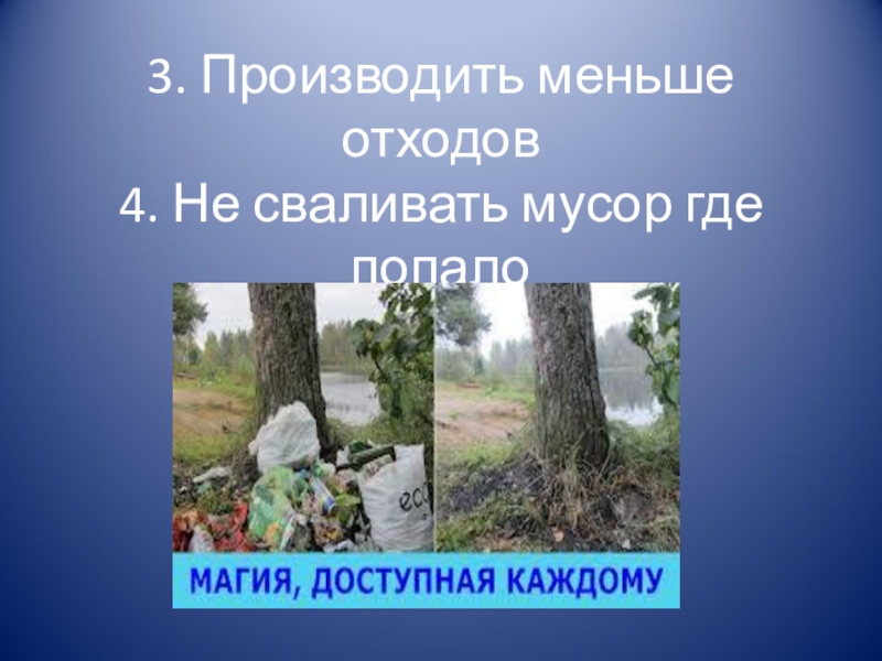 Слайд 17 3. Производить меньше отходов 4. Не сваливать мусор где попало