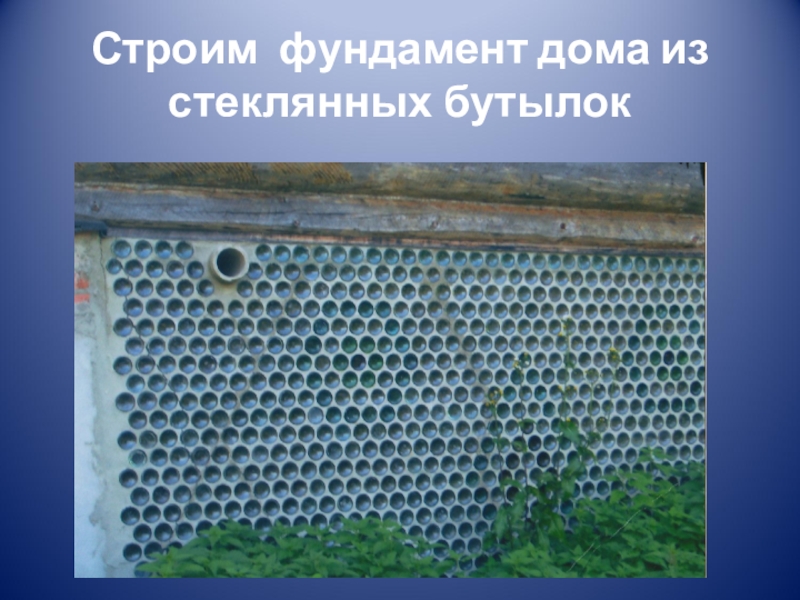 Слайд 40Строим фундамент дома из стеклянных бутылок