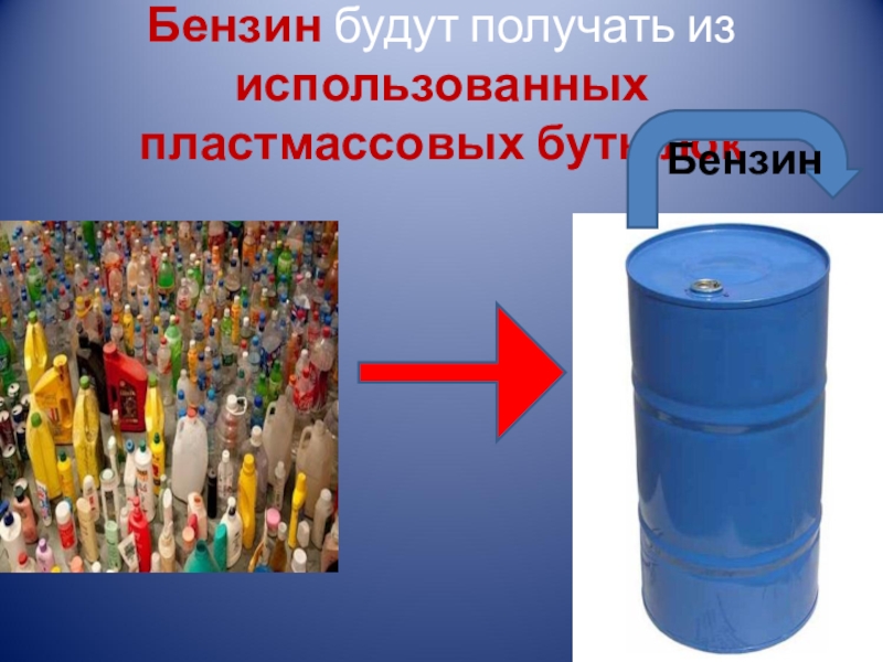 Слайд 26Бензин будут получать из использованных пластмассовых бутылок