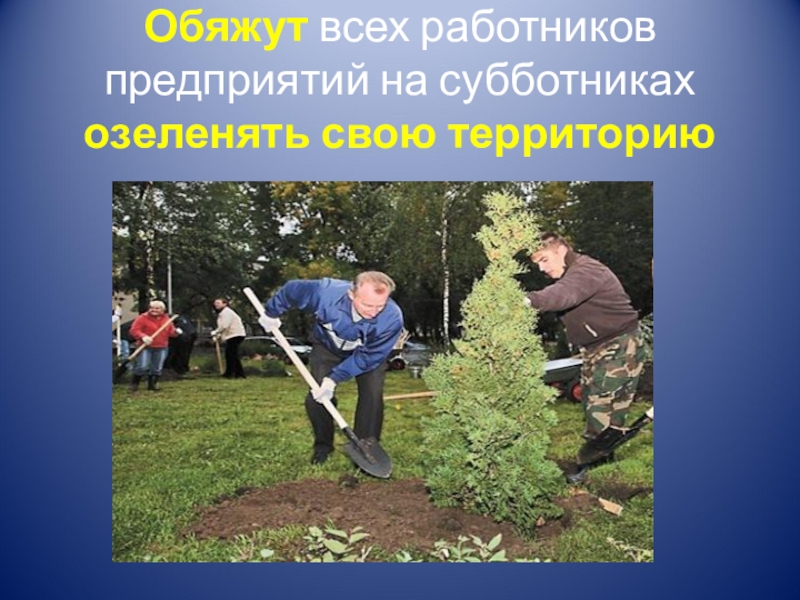 Слайд 24Обяжут всех работников предприятий на субботниках озеленять свою территорию