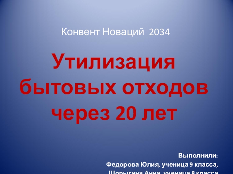 Конвент Новаций 2034Утилизация бытовых отходов через 20 летВыполнили: Федорова Юлия, ученица 9 класса,Шорыгина Анна, ученица 8 класса