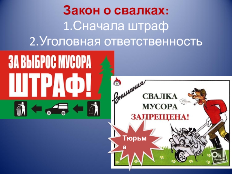 Слайд 21Закон о свалках: 1.Сначала штраф 2.Уголовная ответственность