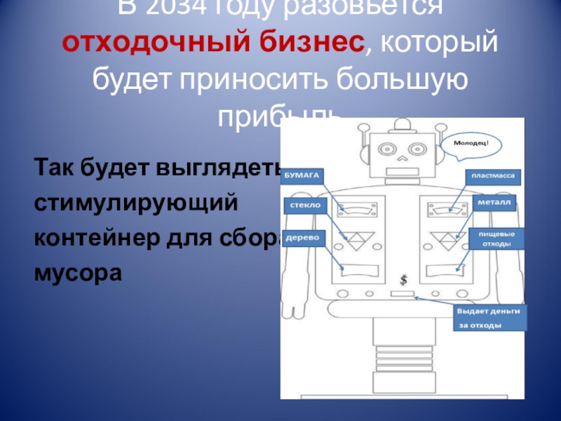 Слайд 25В 2034 году разовьется отходочный бизнес, который будет приносить большую прибыль