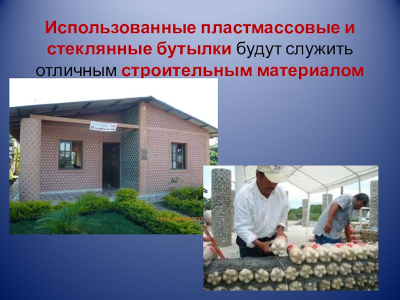 Слайд 29Использованные пластмассовые и стеклянные бутылки будут служить отличным строительным материалом