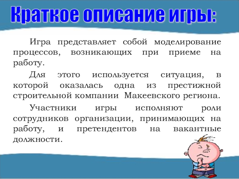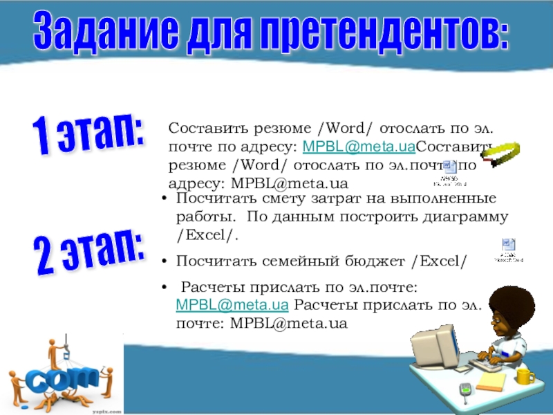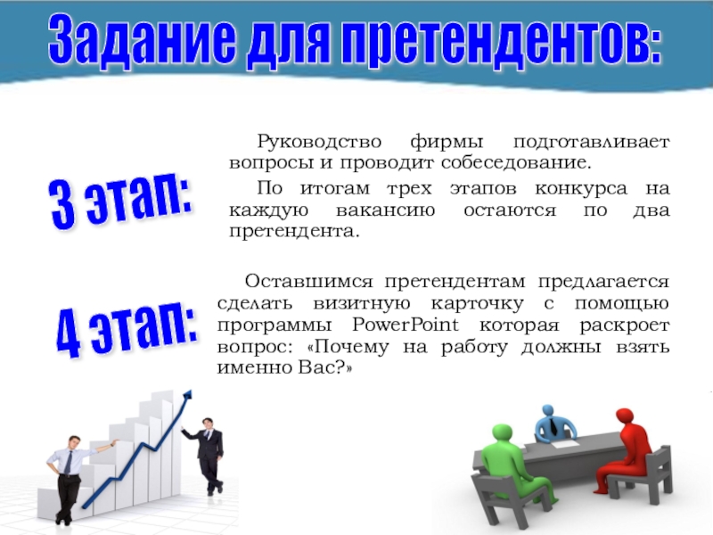 Оставшимся претендентам предлагается сделать визитную карточку с помощью программы PowerPoint которая раскроет вопрос: «Почему на работу должны взять именно Вас?»