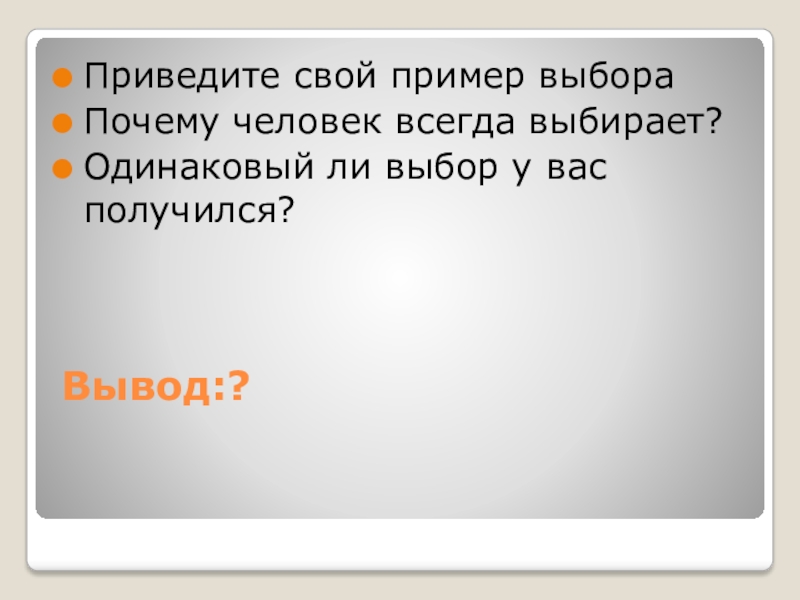 Вывод:?Приведите свой пример выбораПочему человек всегда выбирает?Одинаковый ли выбор у вас получился?