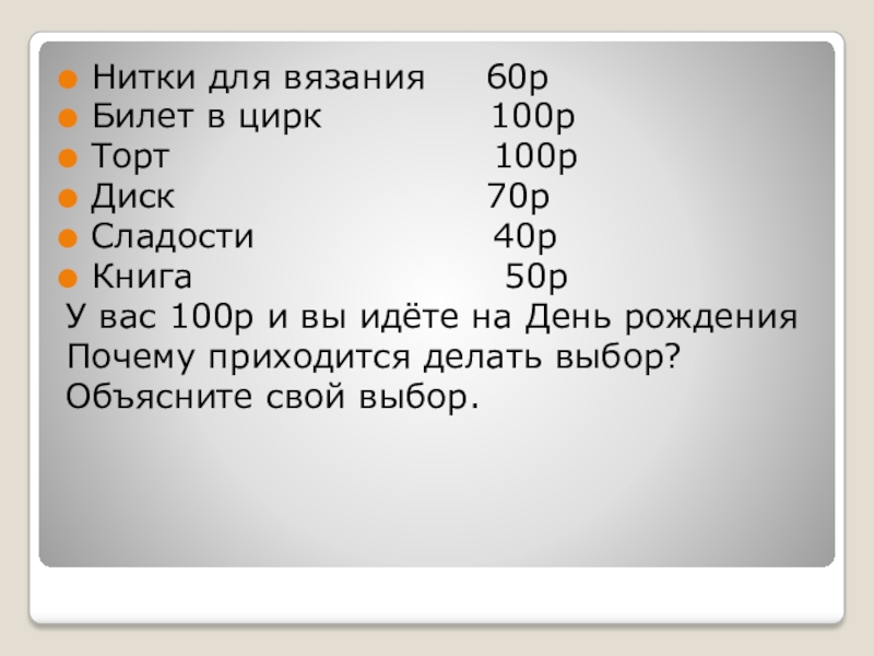 Нитки для вязания   60рБилет в цирк       100рТорт