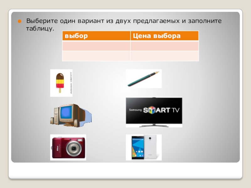 Слайд 7Выберите один вариант из двух предлагаемых и заполните таблицу.