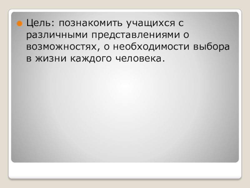 Слайд 2Цель: познакомить учащихся с различными представлениями о возможностях, о необходимости выбора