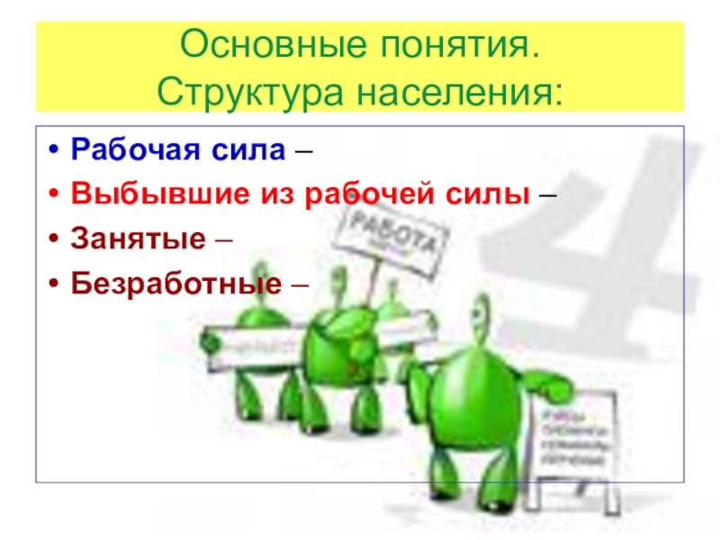 Основные понятия. Структура населения: Рабочая сила –Выбывшие из рабочей силы –Занятые –Безработные –
