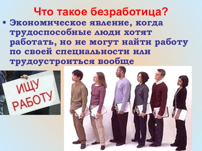 Что такое безработица?Экономическое явление, когда трудоспособные люди хотят работать, но не могут найти работу по своей специальности