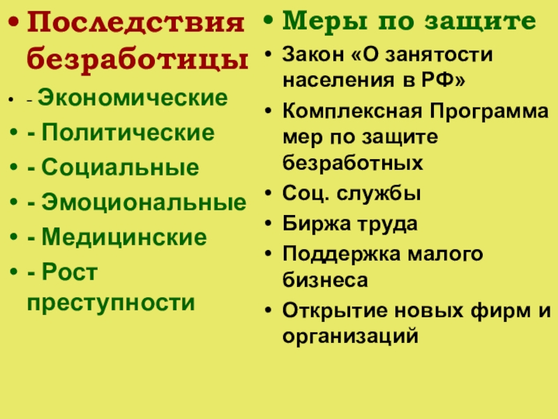Последствия безработицы- Экономические- Политические- Социальные- Эмоциональные- Медицинские- Рост преступностиМеры по защитеЗакон «О занятости населения в РФ»Комплексная Программа