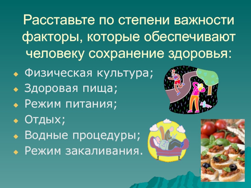 Слайд 4Расставьте по степени важности факторы, которые обеспечивают человеку сохранение здоровья: