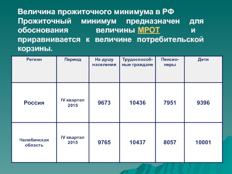 Величина прожиточного минимума в РФПрожиточный минимум предназначен для обоснования величины МРОТ  и приравнивается к величине потребительской корзины.